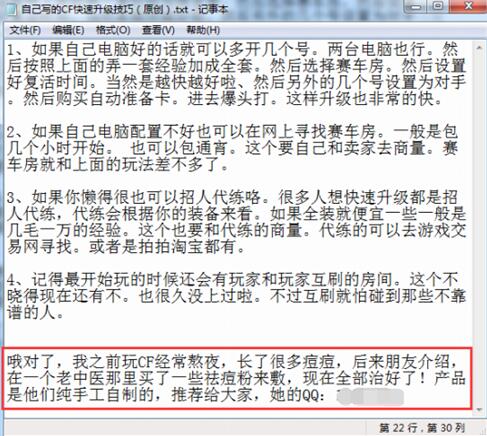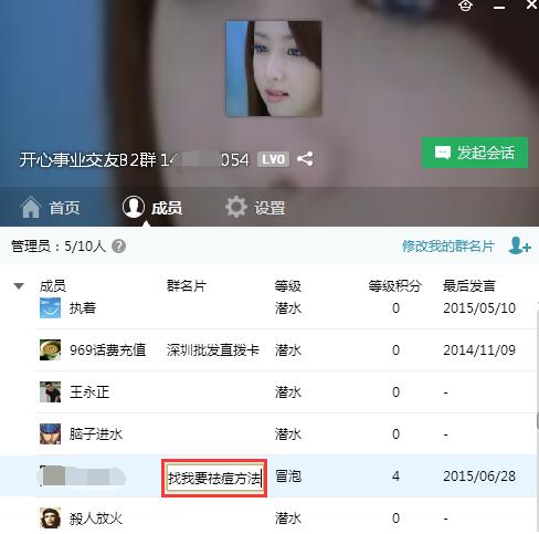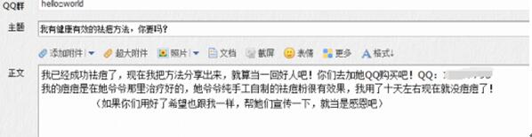 平常多在群里发言,带动群里的氛围,然后跟大家交流,注意不要发任何广告,只需要普通的聊天就行了,哪怕每人跟你聊天,你只需要每天发一些信息,打开群的人自然会看到你的昵称,你每发一次言就是为自己做一次广告!有祛痘需求的人看到你的网名,自然会私聊你所要祛痘方法,这样不会引起群主以及管理员的注意和反感,属于是软文营销!