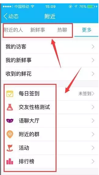 从上图大家可以看到这些功能,大家应该有很多都没有用过吧。而作为一个网络营销人员,在这个这么大流量的软件里我们要做的就是把这些功能最大限度的利用起来,把所有这些功能的玩法摸透,然后从中想办法引流。