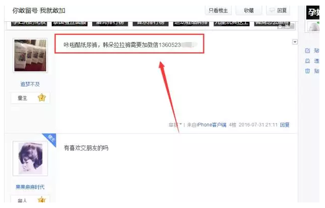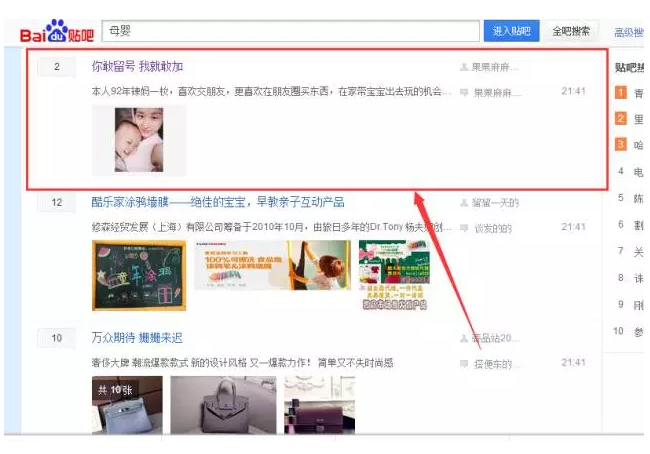比如你是做母婴产品的,你可能想到的引流渠道是贴吧,那好我们去贴吧找找你的同行是怎么引流的。比如说我们看到这样的一篇帖子。