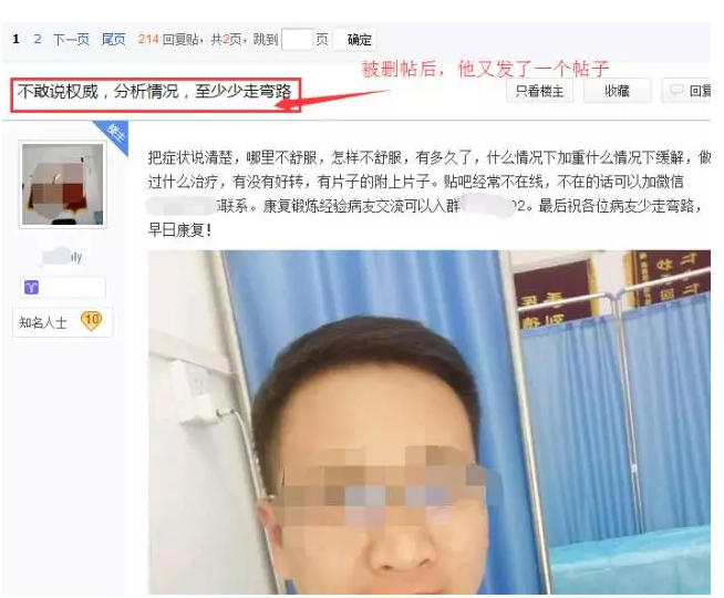 但是还是挡不住他这“专业”医生的步伐,在同一个吧,他又发了一个免费咨询的帖子,这次是直接在帖子里留下了自己的联系方式,而且头像换了。