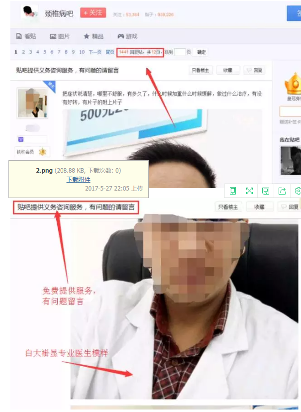 首先其将自己定位成医生,头像和照片都是穿着白大褂的医生模样,然后在颈椎病吧里面发帖,提供免费咨询服务。