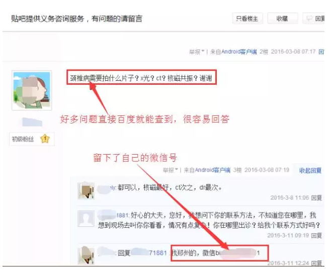 就像上面的例子,他是在和咨询的病人聊着聊着就自然说到了留微信这句话,很自然,并没有打广告的嫌疑。同时留下一个联系方式后,其他的回复我们尽量不要再留了,要不然被吧务发现了,那就等着被删帖了。有时候也可以反其道而行之,像上面一句“无效的话再找我吧”,无形中提醒了网友去找他的联系方式。
