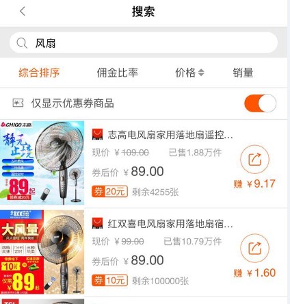 当我们搜索一个关键词的时候,选中“仅显示优惠券商品”,那么展示就都是有优惠券的宝贝了。
