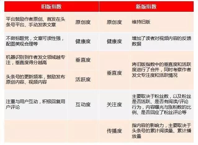 由上图可见,新版的头条号指数头条号指数的5个维度变更为原创度、健康度、垂直度、关注度、传播度,主要变更如下: