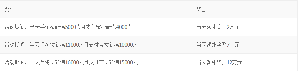 针对11月拉新等级降到B/C的淘客,如果支付宝日均有效拉新数不低于300人,且当月的绑卡率不低于3%或者实名率不低于10%,我们将给予他们额外奖励,奖励金额=支付宝当月有效拉新总数*5元/人;