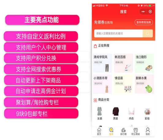 功能架构:导购版仅仅有导购下单,精准解析淘口令,复制口令,和分享的功能;多功能版会有包括分销,返利,积分商城等多种功能。