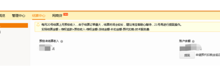 建议您21号登录账户操作提现。比如:6月份确认收货的交易,则要7月20号进行结算。20日这天结算6月1-30号所有确认收货的交易。结算之后会在账户余额中。而7月份确认收货的预估收入则要8月20号结算,以此类推。