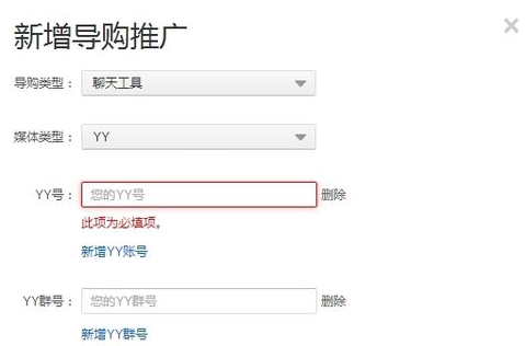 现在会弹出设置框。设置框中有“导购类型”、“媒体类型”,您可以根据自己的实际情况选择相应的导购类型和媒体类型。现以导购类型“聊天工具”,媒体类型“YY”为例。选择好后,系统提示您输入YY 账号或者YY群号。您可以添加多个YY账号或者群号,通过新增字样即可。设置好后,点击确定即可