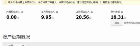 当前的窗口是“概览”页面;这里显示:昨日淘宝客预估收入、本月预估收入、上月预估收入、账户余额。