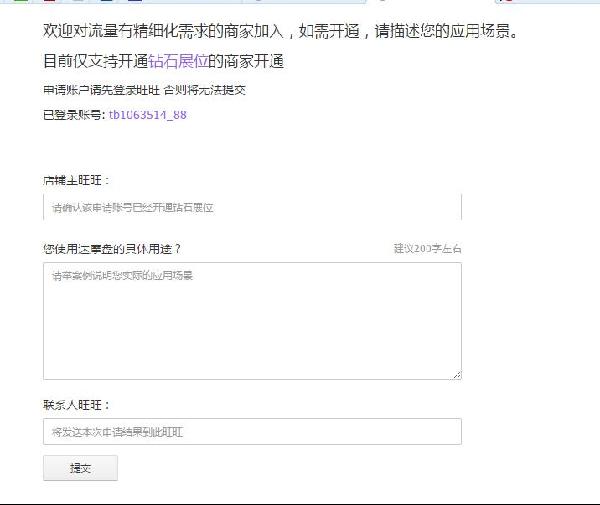 2.按要求依次填写店铺主旺旺,您使用达摩盘的具体用途,以及联系人旺旺等。