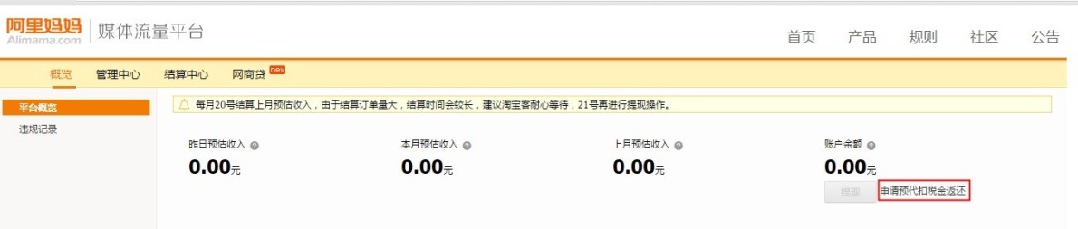 2)申请退税路径:进入我的阿里妈妈账户——账户结算中心——申请预代扣税金返还。