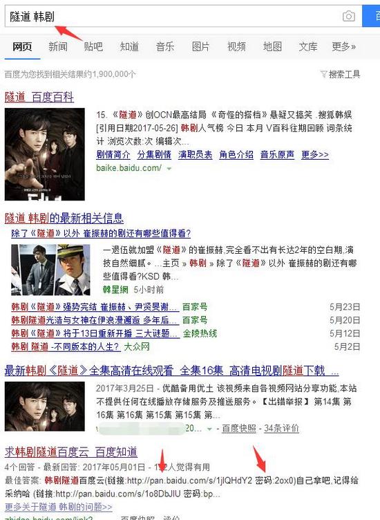 搜一客这里就以最新的韩国电视剧:“隧道”为例子说明,大家搜索关键词查找最新韩剧名字,从百度搜索引擎我们可以看到除了百科和新闻源以外就是百度知道了,我们重点操作的地方就是百度知道淘宝客推广了。