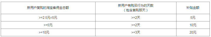 新用户产生的复购行为可以得到5元、10元、20元不等的复购补贴。所有奖励订单需在首购后次月底前完成复购的确认收货。复购需在手机淘宝APP端下单。