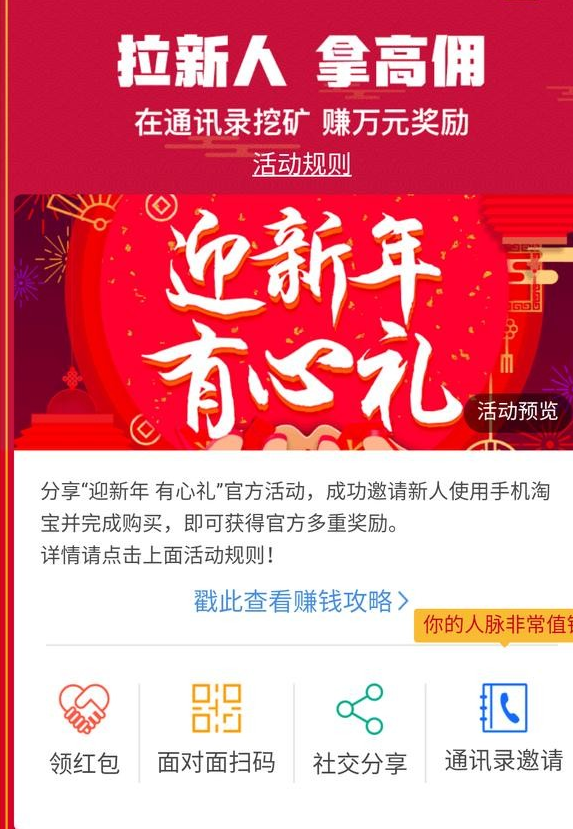 淘宝联盟刚刚推出来的时候是直接高佣金,到后来必须60个浏览量和10订单才能有高佣金,2018年又推出必须拉到3个新客户2018年才能享受高佣金,大家有什么好的解决方案吗? 搜一客为您提供淘宝客开发的重点接口,如高佣金转链接口、淘口令解密(二合一链接解密)、拉新、超级搜索等功能接口,让淘客不再难做。欢迎交流关于淘宝联盟2018年拉新的规则所讲内容以及接口内容。淘客还可以在线制推广图,绕开微信封锁。