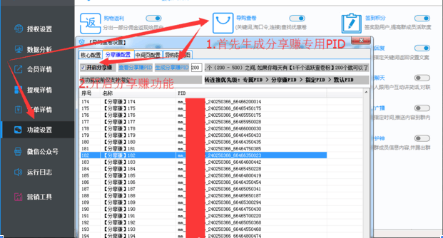 PS:分享赚PID生成完成后,才可以使用分享赚功能,提醒一下用户不要才生成几个就去查分享赚