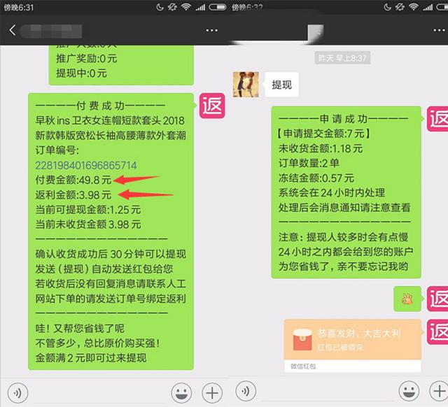 4、收货后发送(提现)提取返利红包
