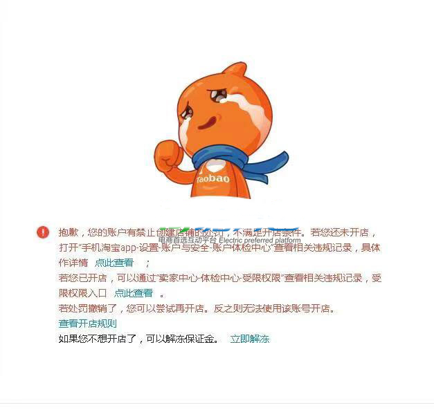 看图,但凡点击开店提示这段话的,都是淘宝号风险问题,注意是淘宝号风险问题,并非支付宝!造成这样的原因有两点: