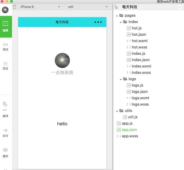 5、大家可以看到上图,左边就是查看编译程序用到的,中间的是预览界面,然后右边的是我们的页面代码。这里我说一下右边的页面代码pages,这个页面都是页面的代码和样式还有就是文件夹等等。