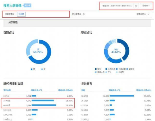作为一个刚刚步入淘宝,没有什么粉丝群体,又没有过硬的技术,也没有足够的推广资金,他产品从定价开始又何尝不是就走入了一个窄巷。如果选择60-90的价位,35%的搜索点击人数占比 那么获取到访客的几率不就翻了5倍么?可能你会说,搜索点击人数占比高的竞争也会大啊,但是机会也大啊!毕竟搜索的人那么多,瞎猫总是会碰上死耗子,总比一天只有3-5个访客来的好。