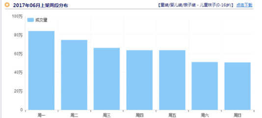 店铺产品上新比较规律且动销较好的店铺机会会更大。这里有2个概念。第一个是固定在什么时间呢,第二个是动销是什么。首先固定的时间每个商家都不一样,需要结合下行业成交量的高峰。一周中哪一天最高。就在这一天。那么至于每次上多少就要根据自己的能力和产品的更新速度 以及第二个概念的动销。只上全部都是0销量放在那里,这样是没有用的。通常当前访客不是很多的店铺,一周固定上一次,访客每天都很多的店铺可以固定每天上传商品。。举个每周集中一天上货的例子大家来看一下。假设你是 儿童袜子类目: