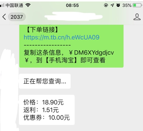 知道了这几种容易封号的原因以后,我这边经过实践,发现通过小程序卡片替换淘口令的做法是比较安全的。我目前身边通过淘客公众号玩返利的朋友,也都是和小程序结合起来玩。比如下图所示,就是我这边其中一个公众号的截图,用户从淘宝,拼多多和京东复制商品链接过来,返回的是小程序卡片。
