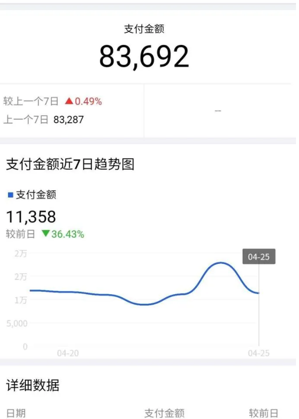 这是他店铺最近七天的数据图,成交额在八万多,基本上一个月的营业额在三十多万。