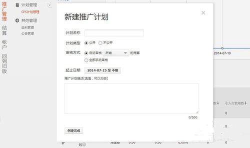 4、进入淘宝客"推广管理"页面以后,并新建推广计划,填写好推广计划里面的信息,如计划名称,审核方式等。