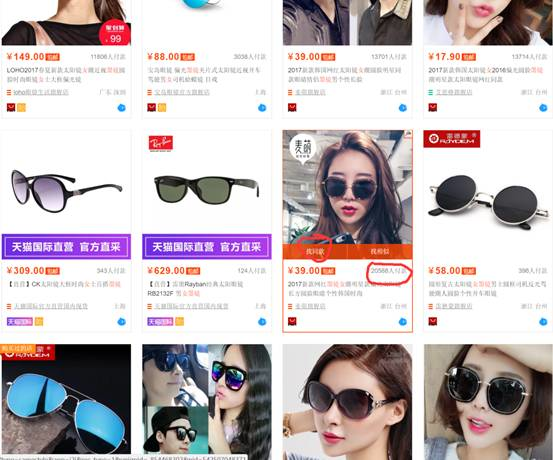 选择商品的时候我们要抛弃之前的去阿里妈妈上找商品的思路,记住我们赚的是差价。选择商品没有太过具体要求,感觉什么能卖的好就卖哪个,我们拿女士墨镜来操作,先在某宝上搜索【墨镜女】,找到了很多墨镜,如图: