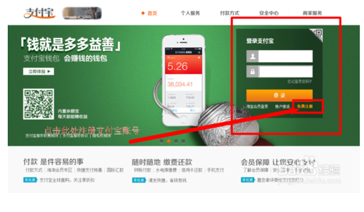 首先我们先打开支付宝首页,页面上有一个支付宝的登录框,在登录框的下面有“免费注册”的字样,我们点击免费注册。