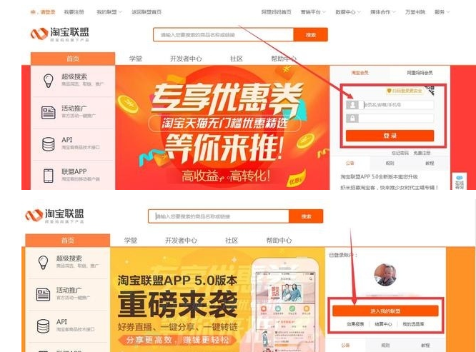 2、在页面右侧登陆你的淘宝帐号,然后点击“进入我的联盟”