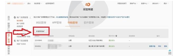 3、进入后,先选择我们的推广渠道。一般没有网站或者APP,那么我们就选择导购推广,有网站或者APP就选择他们就行如图,点击左侧的推广管理→导购管理→新建导购推广。