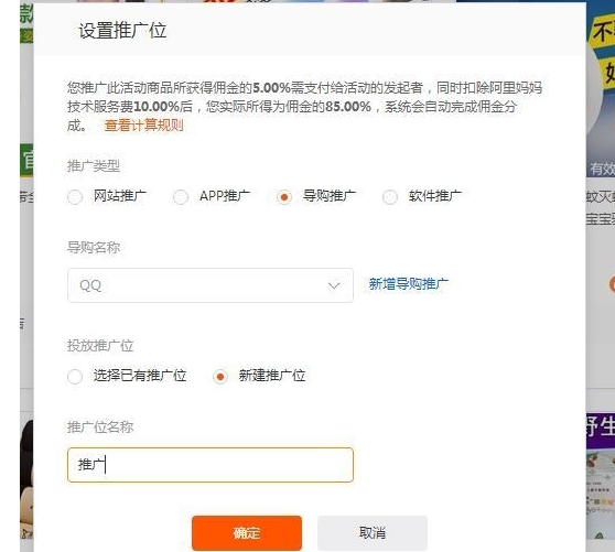 6、选择好产品后,点击“立即推广”,就会弹出“设置推广位”对话框,这个时候选择刚刚我们新建的导购推广。