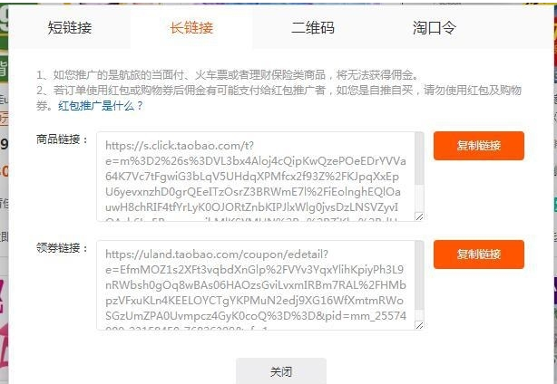 7、设置完成后,就会给你一个推广的链接了,分为短链接、长链接、二维码等推广方式。不同的推广方式有不同的期限。长链接是长期的,短链接和二维码是300天,淘口令只有36天的期限。