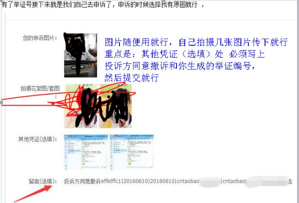 有了举证号接下来就是我们自己去申诉了,申诉的时候选择我有原图就行 ,申诉图片、拍摄花絮随便传一张就是了,其他凭证就上传我们跟上家的聊天记录 ,然后核心就是留言里面
