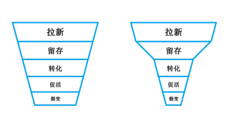 理想的用户漏斗就是一个简单的倒梯形。而如果某个环节做的不好导致流失大,那最终使用五曜淘客变现模型时结果就差别很大了。我们看下对比图。
