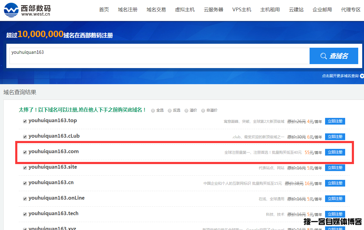 域名注册的话需要到域名服务商那边去注册,我自己是习惯了到西部数码www.west.cn去注册,首次注册的好像优惠20块钱吧,首年注册是55块钱,每年续费也就60块钱不算贵。首次注册的好像优惠20块钱吧,首年注册是55块钱,每年续费也就60块钱不算贵。首次注册的好像优惠20块钱吧,首年注册是55块钱,每年续费也就60块钱不算贵。
