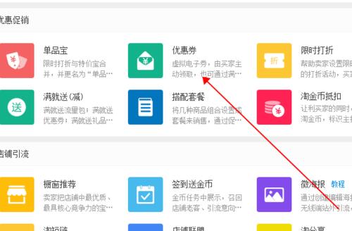 点搜一客宝店铺营销工具,点击优惠券,选择店铺优惠券或者商品优惠券。