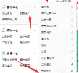2、营销中心细分中选我要推广;然后点击如图进入直通车。