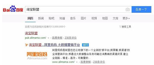 打开百度搜索,输入淘宝联盟关键词,查看搜索结果。