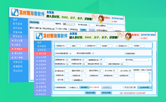 通过及时雨淘客软件可以实现QQ微信返利机器人、QQ微信自动群发优惠券、群邀请裂变、自动采集高佣金商品、及时雨优惠券网站一键上传商品等。
