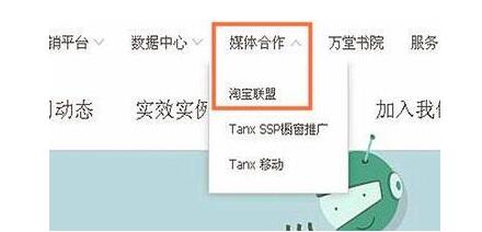 3、淘宝联盟:页面跳转后点击媒体合作下拉按钮中淘宝联盟
