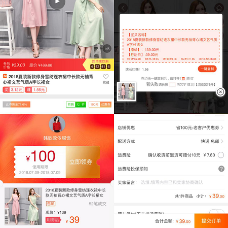 我在淘宝看中了一件衣服,价格还是实惠,我看质量也挺好销量也不错,我放购物车几天,很想下手,正好这次关注了这个公众号,发现这件衣服居然有100元的优惠券,我就买来试试。点击领券,然后打开手机淘宝,就看到了优惠券领取页面。领取了优惠券点击打开产品页面,发现没有什么不同呀,心里有点忐忑,后来直接下单了,在下单页面发现果然自动减了100元。
