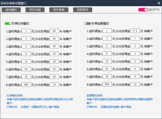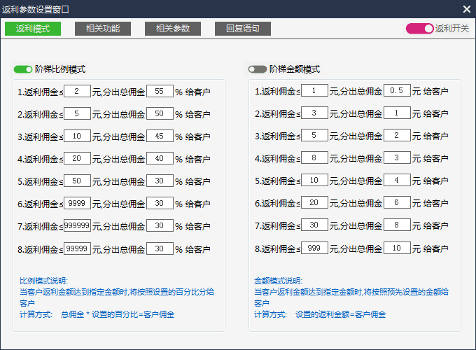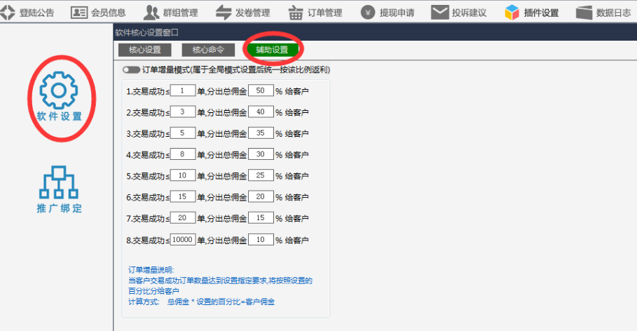 第一种:全局比例,如果勾选了订单增量模式(全局比例模式)。那么软件如果的比例设置都按照全局比例参数计算(个人定向比例和群代理比例除外)