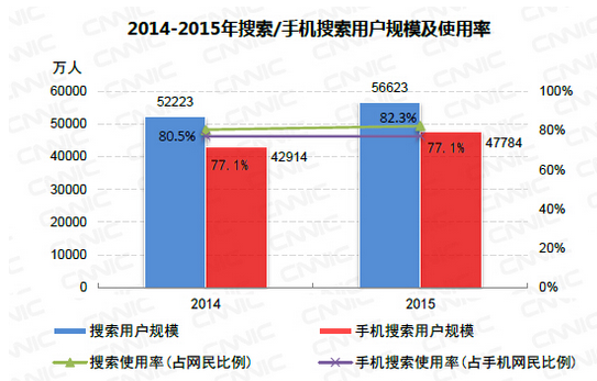 报告显示,截至2015年12月,我国搜索引擎用户规模达5.66亿,使用率为82.3%,用户规模较2014年底增长4400万,增长率为8.4%;手机搜索用户数达4.78亿,使用率为77.1%,用户规模较2014年底增长4870万,增长率为11.3%。(本段引自网易科技)