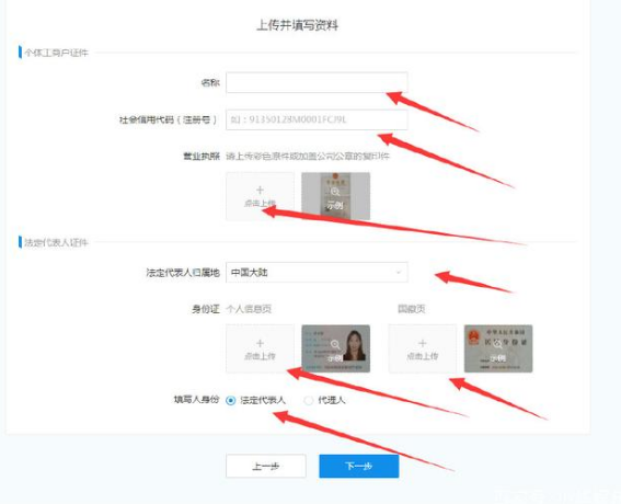 第五步:上传个体营业执照+身份证正反面按照提示操作提交核对信息就行然后提交 第六步:等待审核