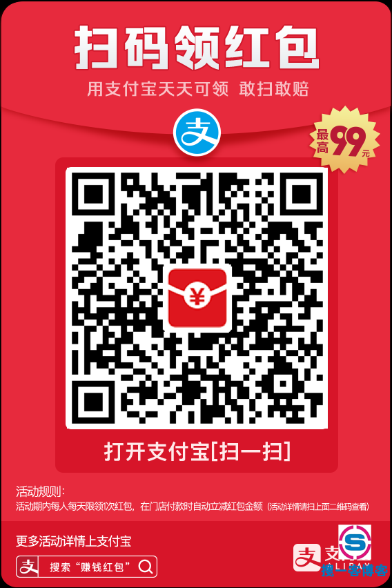 1、扫描红包二维码,有机会获得支付宝余额宝+到店付款双红包