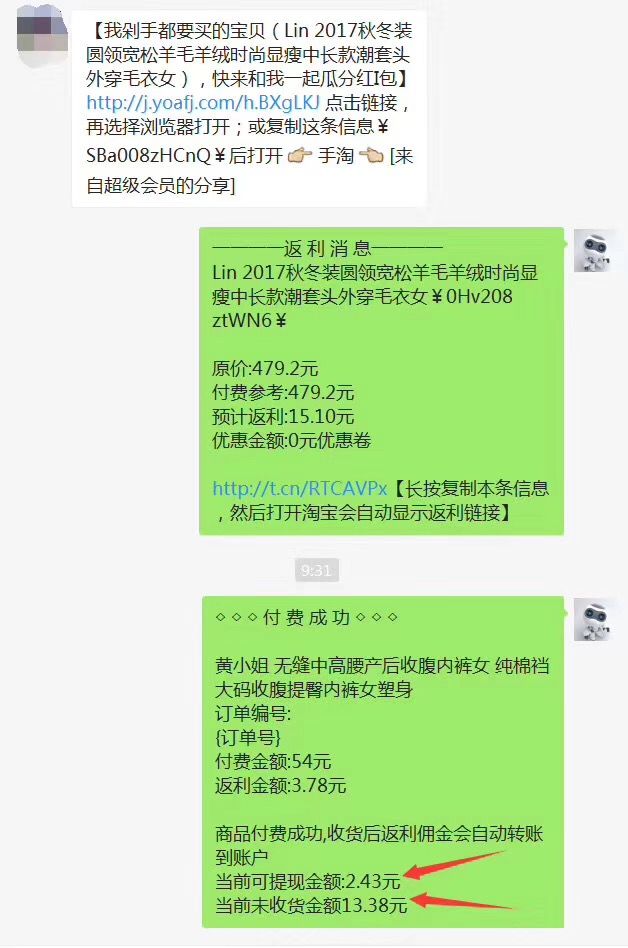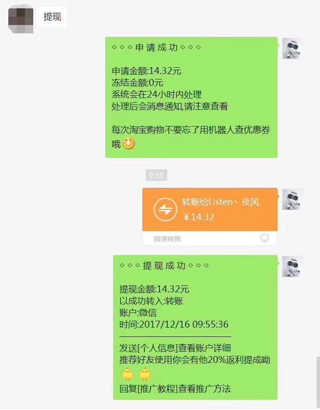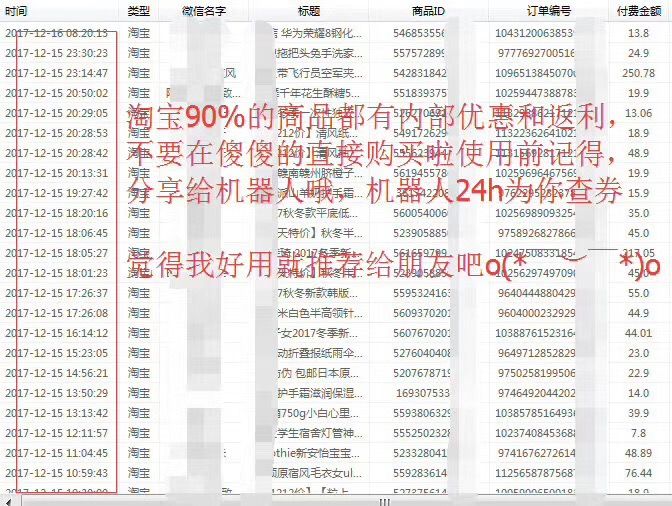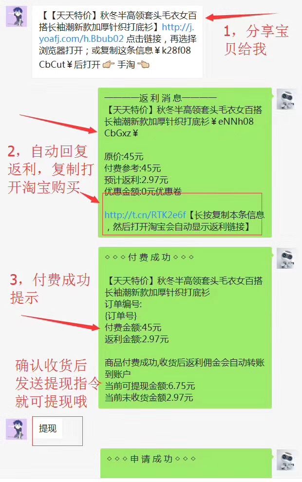 1、去淘宝选择任意你需要的宝贝分享给我 2、优惠券和返利都属于你,复制消息打开淘宝购买,确认收货后发送关键字提现即可 好东西要记得分享~~~(*^▽^*),身边有经常爱淘宝购物的达人记得把我推荐给她哦(*^▽^*),直接发送好友名片给我会自动添加好友(*^▽^*)