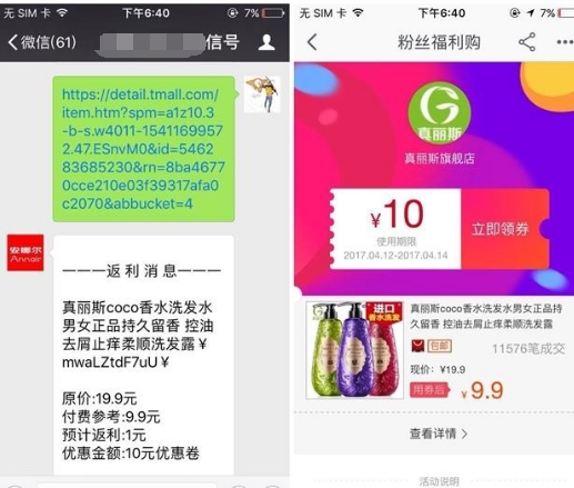 然后我发了一个洗发露的链接给机器人,果然找到了10块钱优惠卷还有1元返利