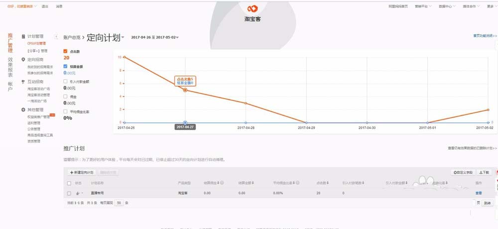 进入淘宝客后台,在账户总览页面下方,你会发现上面这样一个按钮。点击进去,即可开始创建定向计划。
