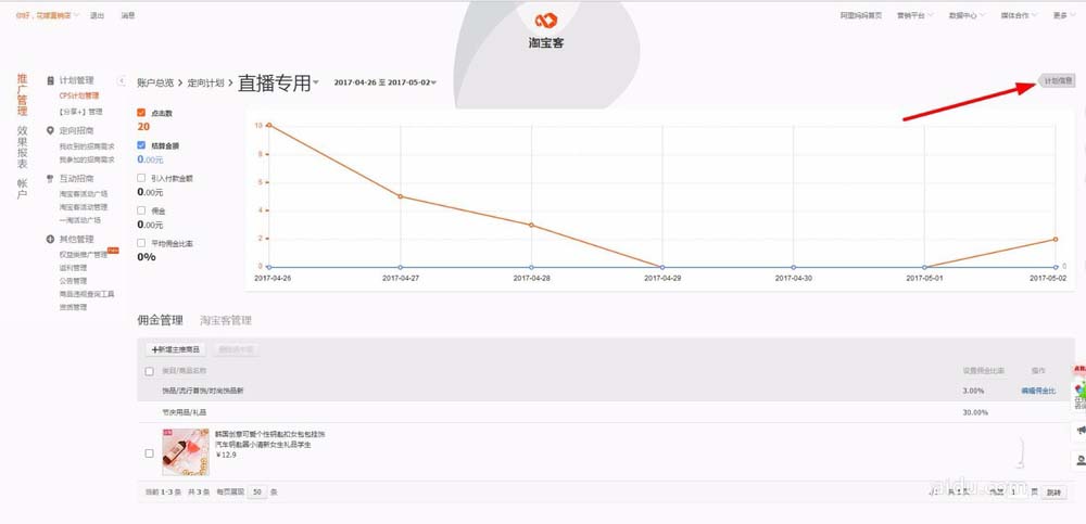 3、进入计划里面的宝贝佣金设置页面,右上角有个“计划信息”